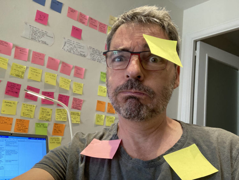 ¿Hay que estar un poco loco para escribir? A juzgar por esta foto, uno diría que sí. Lo que veis en la pared es la escaleta de mi última novela, Entre algodones, escena por escena, así que no sé si hay que echarle locura pero, desde luego, sí mucho pensamiento y largas horas.